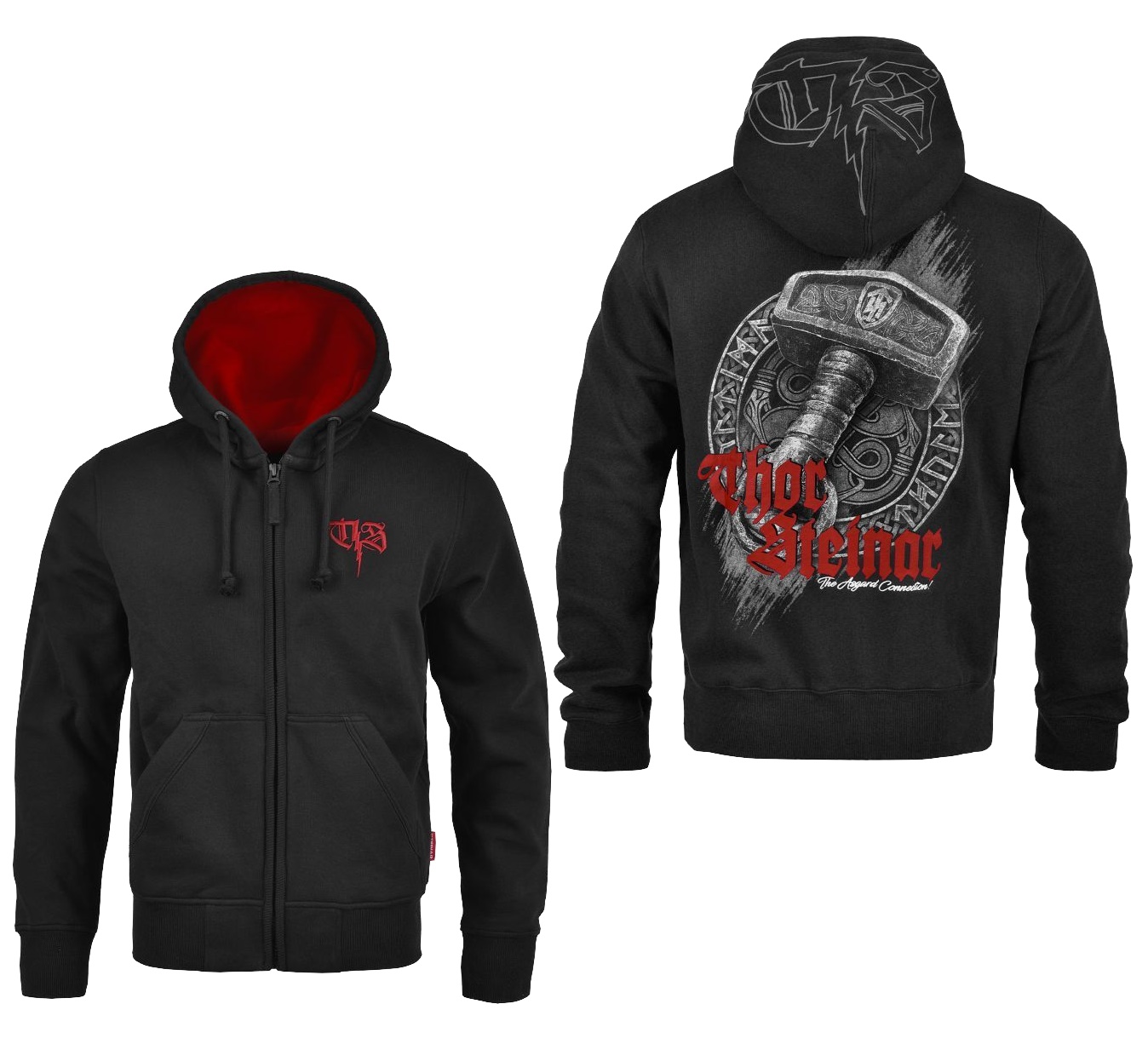 Thor Steinar Kapuzenjacke mit gedrucktem Wikinger-Motiv auf dem Rücken - See you in Valhalla -; und gesticktem Thor Steinar Schriftzug. Gedrucktes TS-Logo auf der Kapuze. Gesticktes TS-Logo auf der Brust und Patch auf dem Arm. Zwei Eingrifftaschen seitlich und Kapuze mit dicken Kordeln.