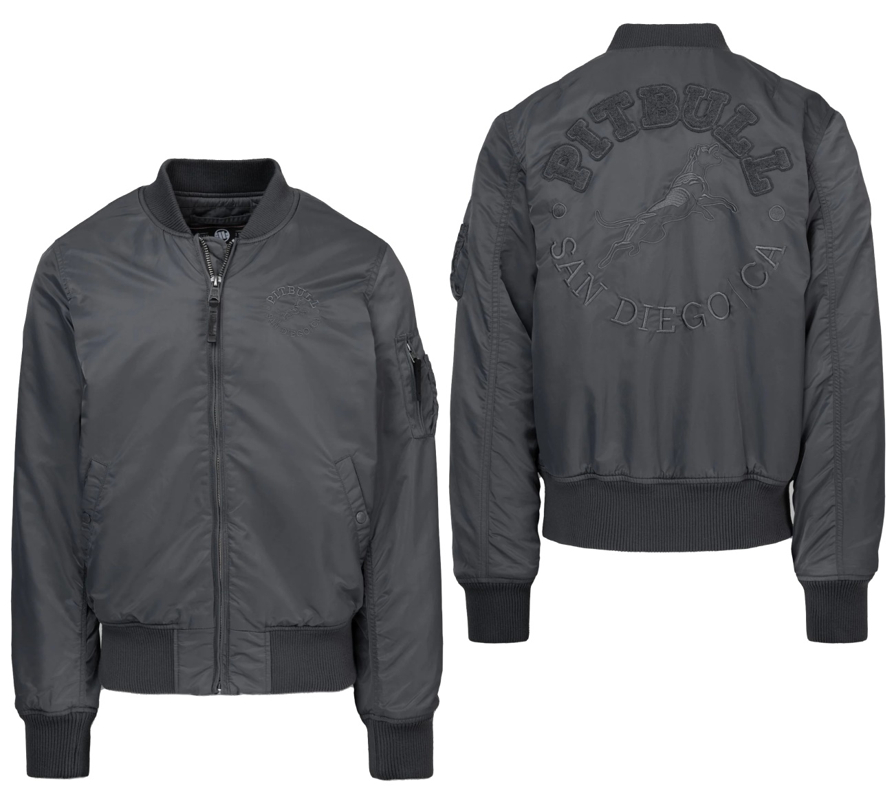 - große bestickte "PITBULL San Diego" Schrift auf dem Rücken und eine kleinere auf der Brust